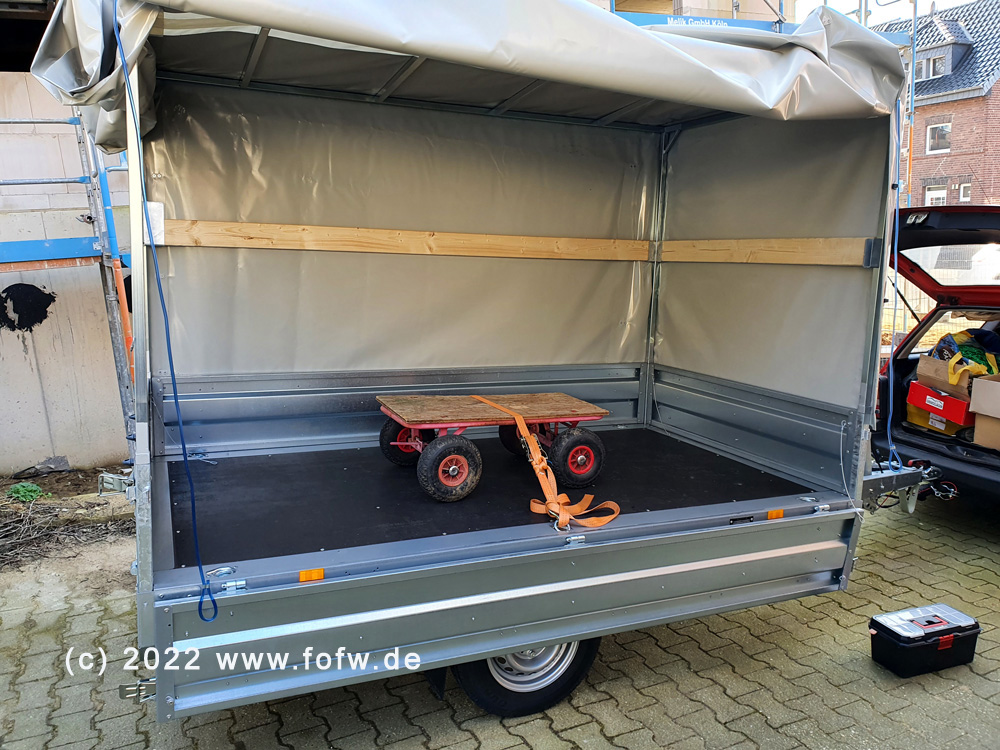 Bei der Überführung zeigte sich, dass der Golf mit seinen 75 PS mit der Stirnfläche des Anhängers ein wenig überfordert ist. Also wird demnächst noch eine passende Flachplane angeschafft. Hochplane und Gestänge sind von der Firma Wagemann so kosntruiert, dass ein Auf- und Abbau auch für eine Person keine Unmöglichkeit ist.