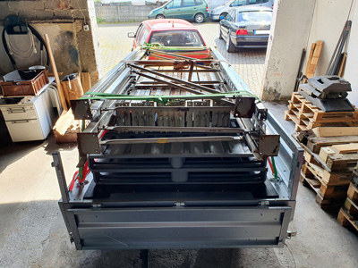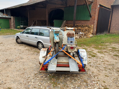 20221028 - Abgabe des Bauwagens In der alten Halle in Borg geht es nun Schlag auf Schlag. Der mit 5 Metern Aufbaulänge wohl sehr begehrte Bauwagen wurde uns förmlich aus den Händen gerissen. Die Abholung erfolgte dementsprechend recht schnell. Uns verließ er nicht auf eigener Achse am Zugmaul des LF8 (wie er vor gut fünf Jahren zu uns kam...), sondern per Trailer. Schade, denn die Substanz war gut - und mit seinem Verkauf ist die Idee eines Bauwagens mit Eletro-Ofens zum Erschmelzen von Rohglas final begraben. Aber das ist ein anderes Thema. Ein Umzug in Westerwald oder Rheinland kam leider aus Platzgründen nicht infrage. 20220924 - Das doppelte Moppedchen Unser LF8 hatte heute nach dem gestrigen "Ausritt" endlich wieder Ruhe. Stattdessen wurde der Plattformanhänger an dan Passat angehangen. Mit ihm machten sich zwei rare Luxus-Moped-Oldtimer aus belgischer Fertigung auf den Weg vom Saarland aus ins neue Quartier. Die Flandria und die Superia warten noch auf ihre Wiedererweckung. Die meisten Teile sind da (ok, nicht auf den Fotos zu sehen, aber im Passat-Kofferraum). Mal schauen, ob die Wiederbelebung in unserer Obhut erfolgen wird oder ob sie doch abgegeben werden. Jetzt sind sie erst einmal wieder eingelagert. Die Umbau-Variante des Plattformanhängers mit den zwei Motorrad-Schienen hat sich jedenfalls bestens bewährt.