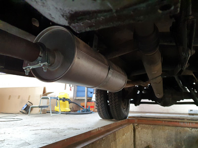 Das hintere Endrohr und auch der Auspufftopf (Original Mercedes / Eberspächer) waren aufzutreiben - das Verbindungsstück leider trotz monatelanger intensiver Suche nicht. Da die Halle in Borg über eine Grube verfügt sollte diese Reparatur (neben einem "großen Service") aber unbedingt noch dort erfolgen. Glücklicherweise konnte das fehlende Stück beschädigungsfrei aus den Defektteilen herausoperiert werden und erwies sich augenscheinlich als noch gut erhalten. Die Idee, die LF508DG-spezifisch an der linken hinteren Aufbau-Ecke endende Auspuffanlage so umzukonstruieren, dass das Rohr (wie bei anderen 508D Standard) vor dem linken Hinterrad endet, wurde auch aufgrund der Disharmonie von Auspufftopf und parat liegendem kurzem Standard-Endrohr aufgegeben. Stattdessen erfolgte eine komplette Wiederherstellung der originalen LF508DG Auspuffanlage - zu 50% mit Neuteilen (Auspufftopf + hinteres Endrohr), zu 50% mit den Altteilen (Krümmer/Hosenrohr + vorderes Endrohr). Zitat: "Jetzt bläst er ja wieder nach hinten rechts". Das bleibt hoffentlich die nächsten 40 Jahre so.