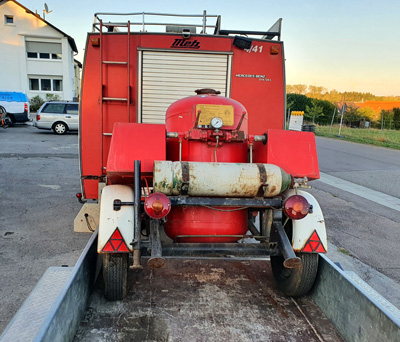 20220911 - Abgabe des TOTAL PLA250 Aus Platzgründen musste uns heute unser alte Pulverlöschanhänger PLA250 von TOTAL verlassen - und das kurz vor seinem 70. "Geburtstag". Der Pulverlöschanhänger wurde per haargenau passendem Baumaschinen-Trailer abgeholt. Da der Pulvertank noch gefüllt war musste das LF8 als Verladehilfe herhalten. Der PLA250 soll demnächst das passende "Anhängsel" für einehemaliges 170er Magirus Deutz Feuerwehrfahrzeug sein.