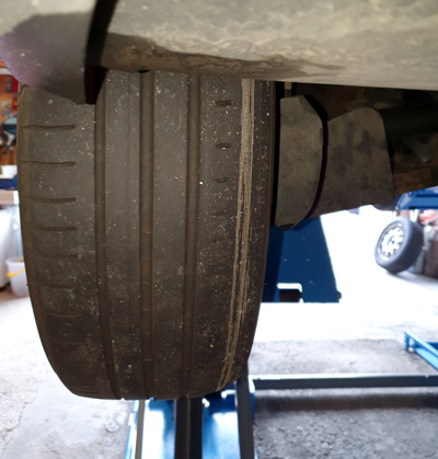 20230726 - Reifenschaden beim Ex-ELF1 / KDOW Volkswagen Golf III Variant Da ist unser Ex-ELF1 / KDOW Volkswagen Golf III Variant knapp an einer Katastrophe vorbeigeschlittert. Beide Vorderreifen waren innenseitig komplett blank abgefahren - sogar die Karkasse blitzte fast vollumfänglich hervor! Das hätte schief gehen können...! Dabei lief der Wagen schön geradeaus, nur die Haftung auf nasser Straße war suboptimal. Vorausgegangen war der Tausch des linken vorderen Radlagers. Der durchführenden Werkstatt unterlief leider ein Rechenfehler bei der anschließenden Spurvermessung. Der Einstellungsfehler lag immerhin an beiden Seiten gleichermaßen vor, was den guten Geradeauslauf erklärte. Zum Glück waren die Reifen sowieso annähernd ablagereif - und ein neuer Satz lag schon bereit. Natürlich wurde der erst nach Korrektur der Achseinstellung montiert.