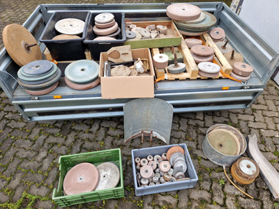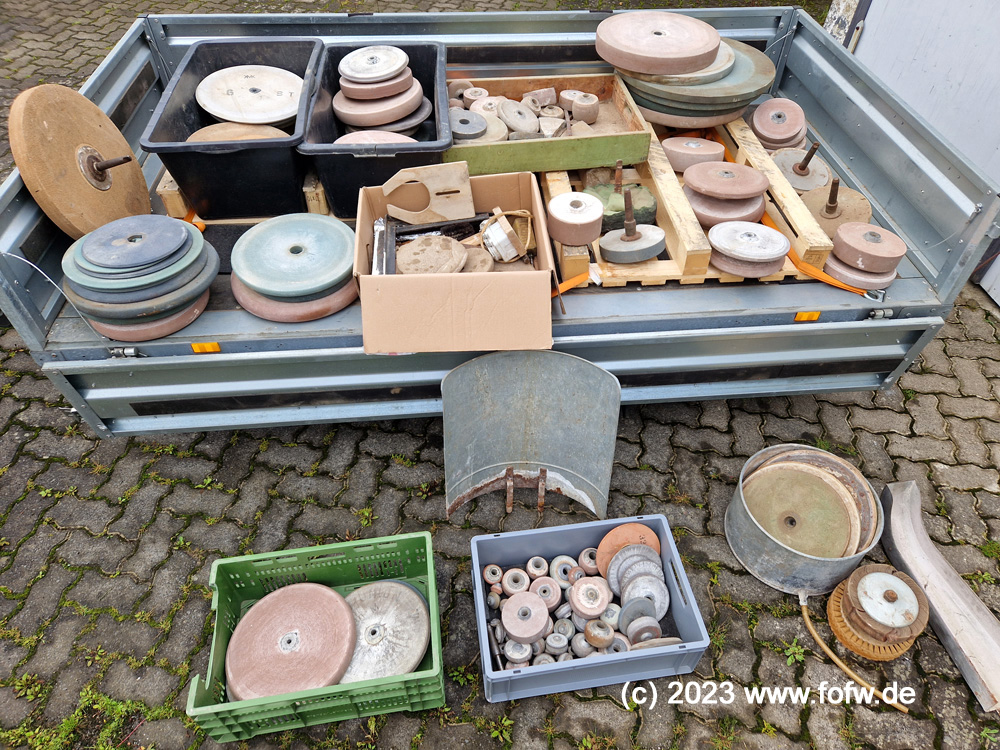 20231230 - Die Glasschleiferei in unserem "Gerätehaus" Die Glas-Werkstatt, mit der sich unser LF8 sein "Gerätehaus" teilt, ist einer der Gründe, weshalb die FOFW in den letzten Jahren weniger aktiv ist. Aus beruflichen Gründen hatte sich schon am letzten Standort im Saarland diese merkwürdige Symbiose entwickelt. Am Standort Westerwald hat es eine neue Gewichtung bekommen, da ein Drehstromanschluss nun den Einsatz von großen Glasschleifmaschinen ermöglicht. Zu der großen Graviermaschine (Kuglerbock), auf der kiloschwere Schleifsteine montiert werden können, ist im Dezember eine schwere Horizontalschleifmaschine mit 50 cm Tellerdurchmesser hinzugekommen. In diesem Jahr ergaben sich sogar zwei Gelegenheiten, den Bestand an Werkzeugen und Arbeitsmitteln für die Glasbearbeitung deutlich zu vergrößern: Im August kamen 600-900 kg Schleifsteine aller möglichen Größen hinzu, kurz vor Jahresende dann die eben erwähnte Planschleifmaschine, ein kleinerer Kuglerbock und diverse Schleifsteine und Schleifmittel. Das war dann sozusagen die erweiterte Probefahrt nach dem Tausch der hinteren Radlager.