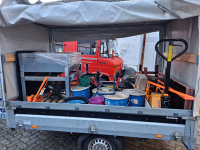 20230401 - Eine Scherenhebebühne für die neue Halle In den letzten Jahren hat sich die Grube in der Halle im Saarland als extrem praktisch erwiesen. Die Perspektive, Ölwechsel, die beim Golf anstehende Getriebeöl-Kontrolle und andere Servicetätigkeiten wieder rücklings unter Wagenheber und Böcken auf dem Boden rutschend durchführen zu müssen - ein Graus! Man wird schließlich älter und damit nicht unbedingt flexibler. Eine sogenannte "Reifendienst-Scherenhebebühne" könnte doch die Lösung sein. Leider erwie sich der Hallenboden der Halle im Rheinland als ungeeignet (Backstein-Setzung), zudem ist sie zu niedrig. Die Halle im Westerwald ist zwar klein, hat aber einen festen Betonboden, auf dem laut Zeitzeugen und Dübellöchern bereits früher schon mindestens einmal eine Hebebühne stand. Aufgrund der Platzverhältnisse war es aber nur möglich, eine Scherenhebebühne UNTER dem LF8 zu installieren. Nach einiger Internet-Recherche bot einzig die TwinBusch TWS3510E geeignete Abmessungen, denn da das LF8 aus Platzgründen ÜBER der Hebebühne geparkt werden muß, ist eine entsprechende Spurbreite der Bühne erforderlich, damit sie mit beiden Vorderrädern des LF508DG überfahren werden kann. Nach peniblem Vermessen von Achs-/Radabstand sowie Spurbreiten von LF8 und dem kleinsten Fahrzeug im Fuhrpark, dem Ex-Feuerwehr-Golf, erschienen die knapp 2 m Breite der TSW3510E gerade noch ausreichend und die Länge genau passend. Elektromagnetische Entriegelung der Sicherheits-Rastung ist auch eine gute Idee. Dadurch ist keine Druckluft erforderlich ... das wäre zwar kein Problem, aber der Kompressor ist so höllisch laut und es dauert immer so lange, bis der den Kessel gefüllt hat. Eletromagnetische Entriegelung ist zwar teurer, aber besser. Die 3,5 t Hublast, die bei dieser auch für SUV geeigneten Bühne durch Hebelsystem schon aus der Nullstellung verfügbar sein sollen, könnten auch eine Option zum achsweisen Anheben des LF8 ("Kampfgewicht" > 6 t!) sein. Dann wäre das regelmäßige Abschmieren der Vorderachse ein Kinderspiel. Die Hubhöhe von 1 m ist zwar nicht die Welt, sollte aber für die meisten Tätigkeiten reichen. Ein 400 V Anschluß liegt in der Halle, dann also diese Version und nicht 230 V mit der Aussicht, vielleicht die Sicherung zu überlasten. Natürlich war das nicht die billigste Lösung. Gebraucht nicht verfügbar, also Neukauf mit Abholung in Bensheim. Dann aber bitte direkt mit zwei Quertraversen und auch dem Mobilset, denn dann kann die Bühne bei Nichtgebrauch paraktischerweise durch nur eine Person weggeschoben werden. Theoretisch. Insgesamt ein teurer Spaß, aber praktisch - und vermutlich die letzte Hebebühne, die ich je kaufen werde. Dank Steuer-Rückzahlung eine just in diesem Moment reslisierbare Investition. Die TwinBusch-Webseite bietet idealerweise sogar Informationen zu den Packstück-Abmessungen. So konnte der Brenderup 4260SB1200 Anhänger durch Abbau der seitlichen Ladebordwände entsprechend vorbereitet werden. Gut verzurrt ging es dann mit Golf und Anhänger von Bensheim in den Westerwald. Dank Handstapler und hydraulischem Motorkran waren das Entladen des gut 500 kg wiegenden Packstücks und eigentlich auch das Aufbauen kein Problem - bis auf die Verpolung des 400 V-Anschlusses, wodurch die Ölpumpe der Bühne zunächst nur Luft pumpte. Aber auch das war schnell lösbar. Um die Verschiebbarkeit beizubehalten sollte die Bühne ursprünglich nicht mit dem Hallenboden verschraubt werden. Da machte aber das LF8 einen Strich durch die Rechnung, da es - statt mit den Vorderrädern darüber zu fahren - die halbe Tonne Hebebühne einfach bis zur Hallenwand vor sich her schob! Nun gut, Verschrauben ist ja auch besser. Das Mobilset war trotzdem keine Fehlinvestition, denn bei Postionierung und Montage der Bühne war es extrem hilfreich. Das erste Ausprobieren der Schwerenhebebühne war dann auch direkt "erfolgreich", denn am Golf konnte eine defekte Antriebswellen-Manschette diagnostitiert werden. Beim letzten Ölwechsel in der Grube in der Halle im Saarland war die noch nicht aufgefallen, was aber auch an der auf der Hebebühne (im Gegensatz zur Grube) vollständig ausgefederten Radposition liegen kann. Wie auch immer, das muß zeitnah gemacht werden. Danke an Murph für die (Ab)Ladehilfe!